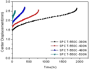 现场微损取毛坯试样,加工成小冲杆试样,在550℃温度下的小冲杆蠕变试验,试验过程中保持恒温恒载条件,记录试样下表面中心点的位移-时间曲线,每个试样都出现了断裂,可以得到不同载荷下的断裂时间。再通过对位移-时间曲线进行处理,获得不同载荷下的蠕变应变-时间曲线,进而获得稳定段的最小蠕变应变速率,可以进行剩余寿命预测。