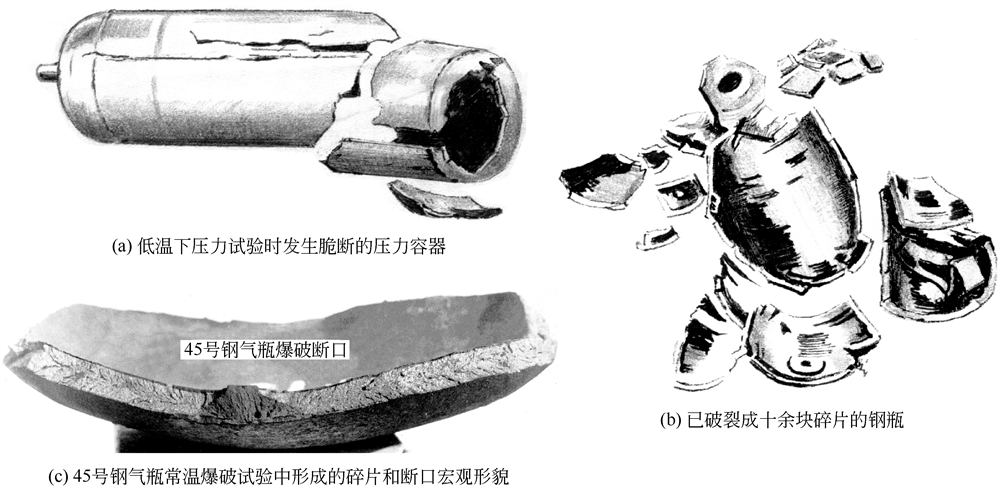 定义脆断的主要依据是变形量的大小,但又很难确定变形量的定量界限。不过仍可以定性地按照发生脆断的基本原因将承压设备的脆性断裂分成如下两个大类。(1)因材料本身的脆性或使用中发生脆性转变而发生结构的脆性断裂失效。(2)因结构中存在重大缺陷而造成结构材料在远低于设计规定的载荷下发生脆性断裂,这称为低应力脆断。图1.1是低温压力容器在做低温压力爆破试验时发生脆性爆炸后的情况,2只容器都在低温脆断时形成了碎块。