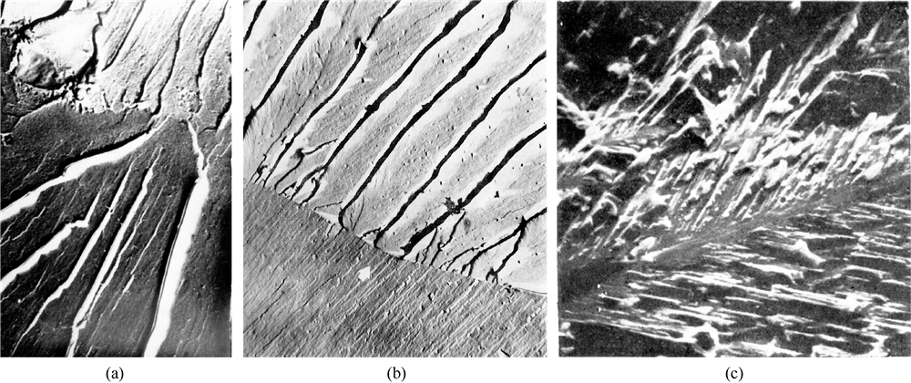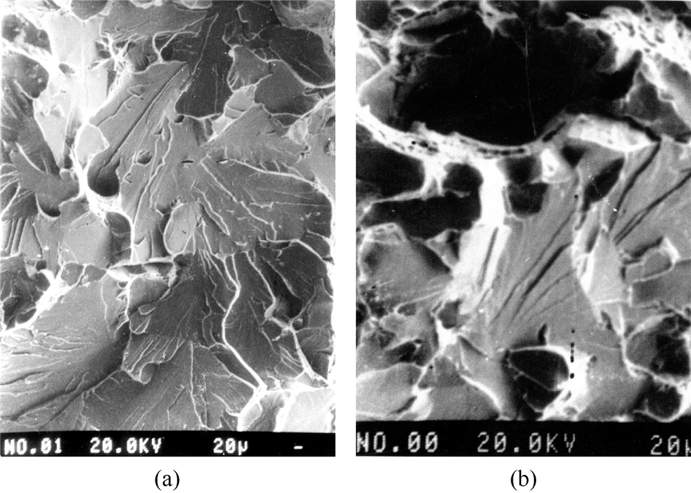 低温冷脆是许多铁素体类钢材的共同特征。材料的脆断机制主要是准解理或解理断裂。当出现解理断裂时,断口的宏观状态是有闪光的亮白色的新鲜状,整个断口平齐并与最大主应相垂直,不会出现与最大主应力呈45°角的剪切断口。所谓闪光感觉正是无数的方向各异的小刻面(即晶体的解理面)对自然光线的反射所造成的。这种正断口在边缘(接近表面处)不会出现韧性断口常见的剪切唇。断口上也不存在能指示,断裂方向的放射纹和人字纹。解理断口的电子显微照片一般呈现出河流花样,如图1.3所示。其中图(c)的解理扇形区所反映的是整个晶粒内全解理面的细观形貌。而理面穿过晶界时的进一步观察河流的变化可在图1.4中分为2种情况分别表示在图1.4中。两晶粒相隣连接但方位取向分小倾角和大倾角(扭转倾角)两种情况,见(a)和(b)。