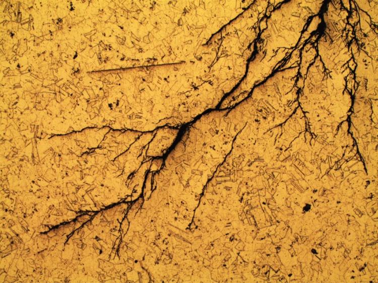 由于应力腐蚀裂纹的萌生与扩展均与应力(尤其是拉应力)有关,因此应力腐蚀裂纹大体与最大主应力相垂直。在焊缝上的应力腐蚀裂纹多数为垂直于焊缝方向扩展的横向裂纹,且多条裂纹相互平行。有些常压容器的焊缝也会出现典型的应力腐蚀裂纹,其应力来源主要是焊接残余应力。应力腐蚀裂纹即使有若干分枝,但其主干裂纹仍基本上与主应力相垂直。