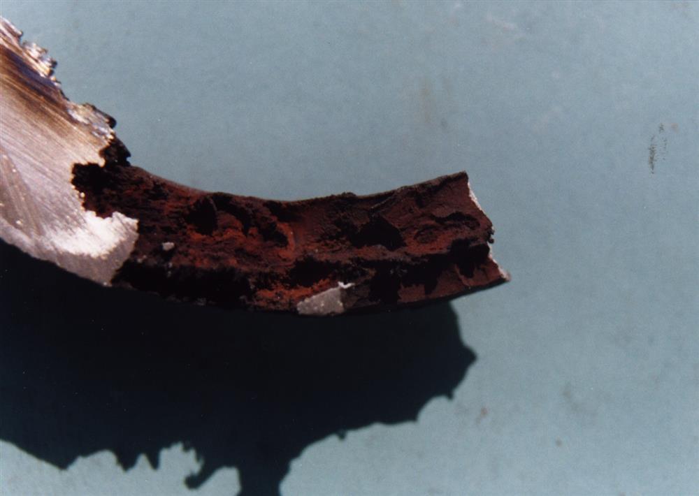 炉管材料为25Cr35Ni。入口管下接头焊缝取下的试样,从内表面看,除穿孔外,焊缝大部分已出现严重减薄,接近穿透,呈熔融岩状,表面有暗红色的锈蚀层,是氧化特征。