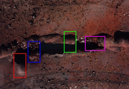图2.5为炉管穿孔部位取样位置。由于最初的腐蚀源已穿孔不复存在,故图中粉色区域可以作为近似的腐蚀原始区域,对该处能谱分析可以判断引起腐蚀起因的因素。绿色区域为焊缝表面的腐蚀情况,蓝色区域为熔融的颗粒状组织,对其取样进行能谱分析和X射线衍射分析。红色区域为流动后的瘤状物,分析表面的腐蚀产物情况。