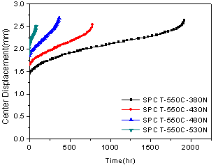 现场微损取毛坯试样,加工成小冲杆试样,在550℃温度下的小冲杆蠕变试验,试验过程中保持恒温恒载条件,记录试样下表面中心点的位移-时间曲线,每个试样都出现了断裂,可以得到不同载荷下的断裂时间。再通过对位移-时间曲线进行处理,获得不同载荷下的蠕变应变-时间曲线,进而获得稳定段的最小蠕变应变速率,可以进行剩余寿命预测。